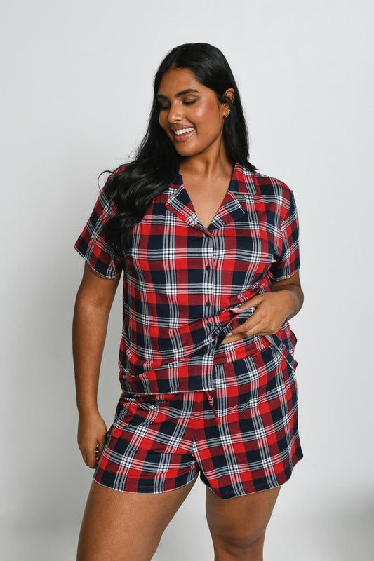 Soft Touch Button Up Short Pyjama Set - Navy & Red Check