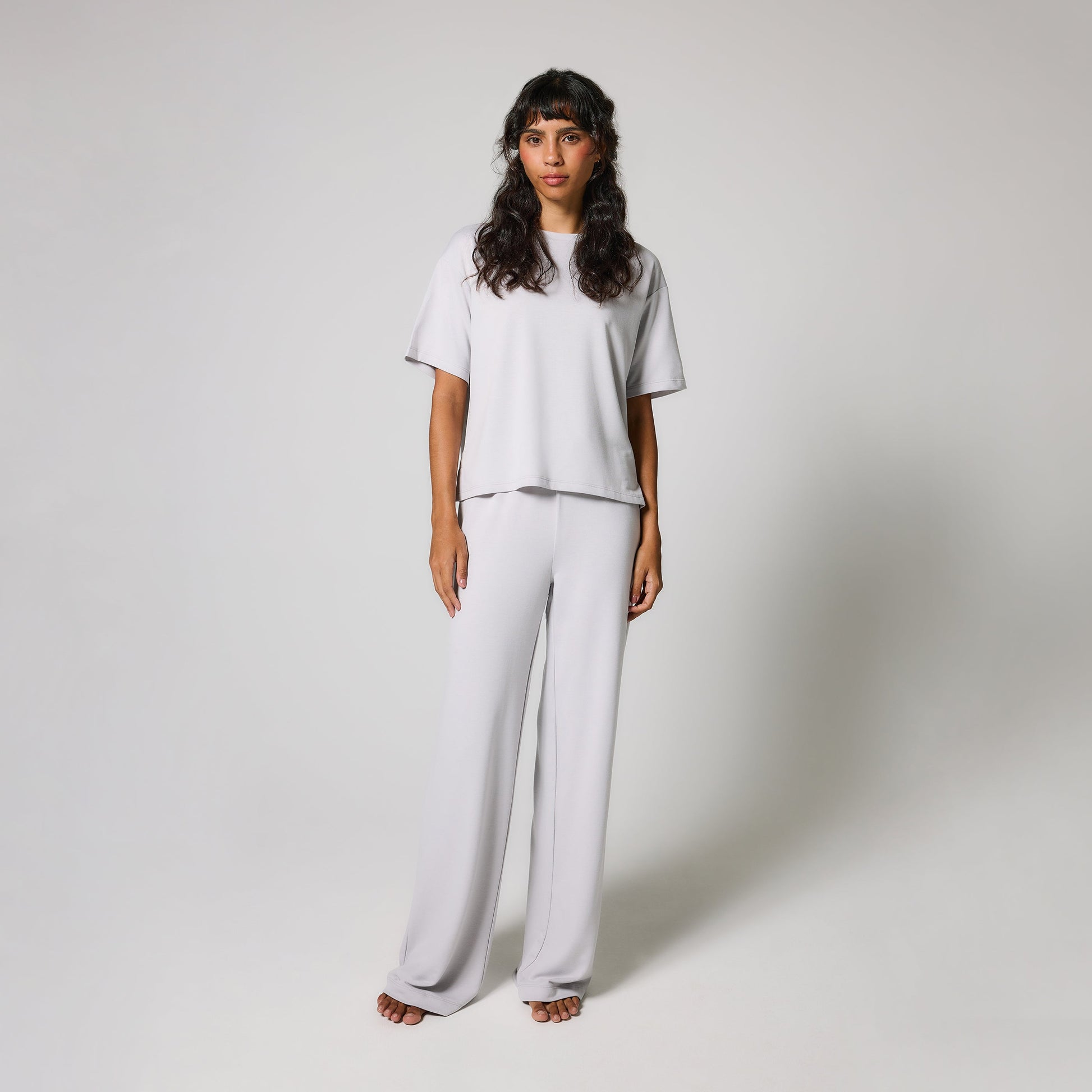 The ultimate cosy combination of a short-sleeved T-shirt and Wide Leg Trousers, with the Soft Touch Lounge Set. Designed to elevate your relaxation looks, with details that matter. The bottoms have a drawcord detail to give you the ideal fit, whilst the t-shirt has a relaxed and dropped shoulder design. Crafted with premium, soft-touch fabric for perfected cosiness.
